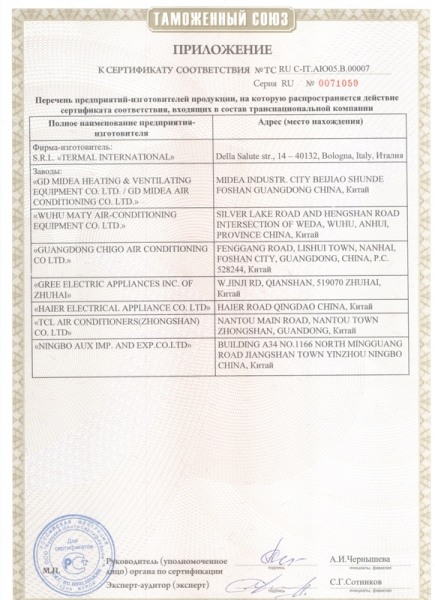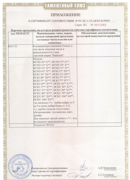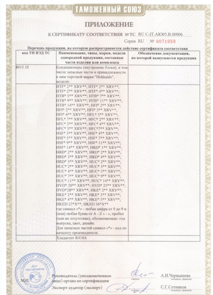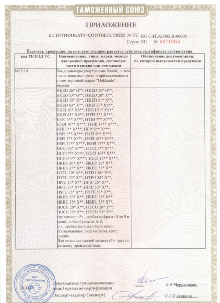 Сертификат соответствия на сплит-системы Hokkaido. Приложение
