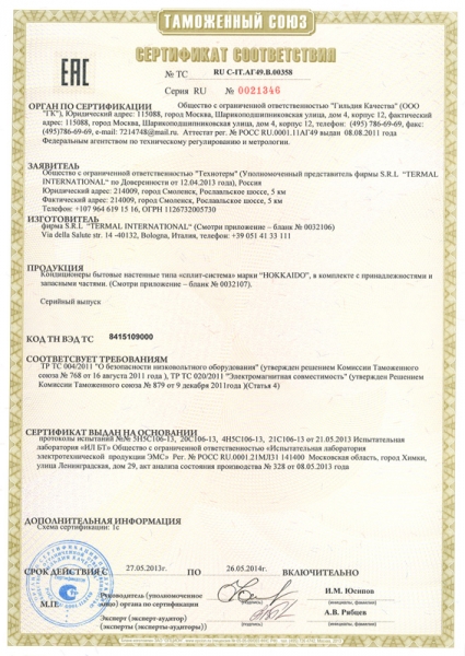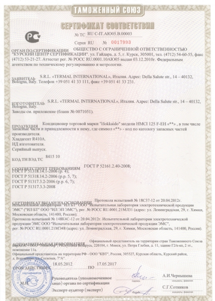 Сертификат соответствия на кондиционер Hokkaido HMCI 125 F-EH