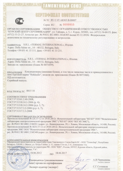 Сертификат соответствия №0099955 на кондиционеры (внешние блоки) Hokkaido