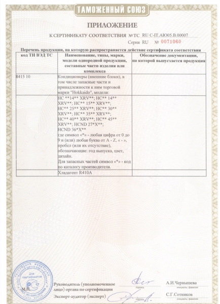 Сертификат соответствия №0017994 на кондиционеры (внешние блоки) Hokkaido. Приложение 1