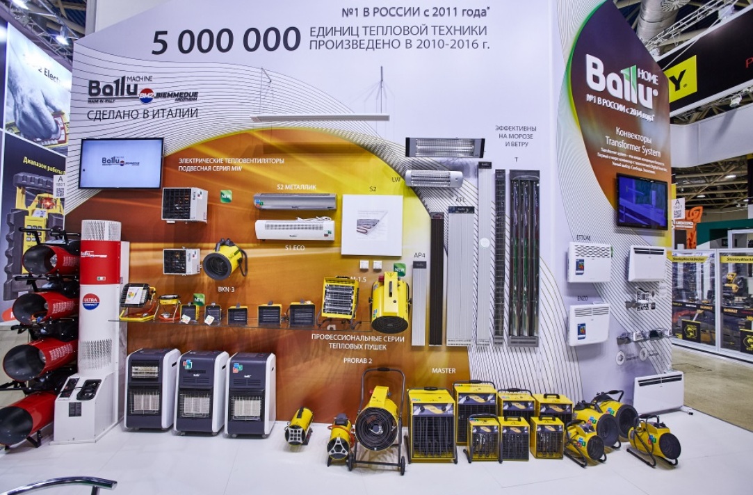 Отдельным блоком на стенде промышленного концерна Ballu было представлено профессиональное тепловое оборудование Ballu-Biemmedue (Италия): дизельные мобильные нагреватели инфракрасного излучения, мобильные газовые и дизельные теплогенераторы прямого и непрямого нагрева мощностью от 21 до 221 кВТ, подвесные и стационарные теплогенераторы большой мощности. Сфера применения этой тепловой техники – объекты гражданского и промышленного строительства, агропромышленного комплекса, ЖКХ. Все оборудование адаптировано к требованиям российского рынка и предназначено для работы в самых экстремальных климатических условиях.