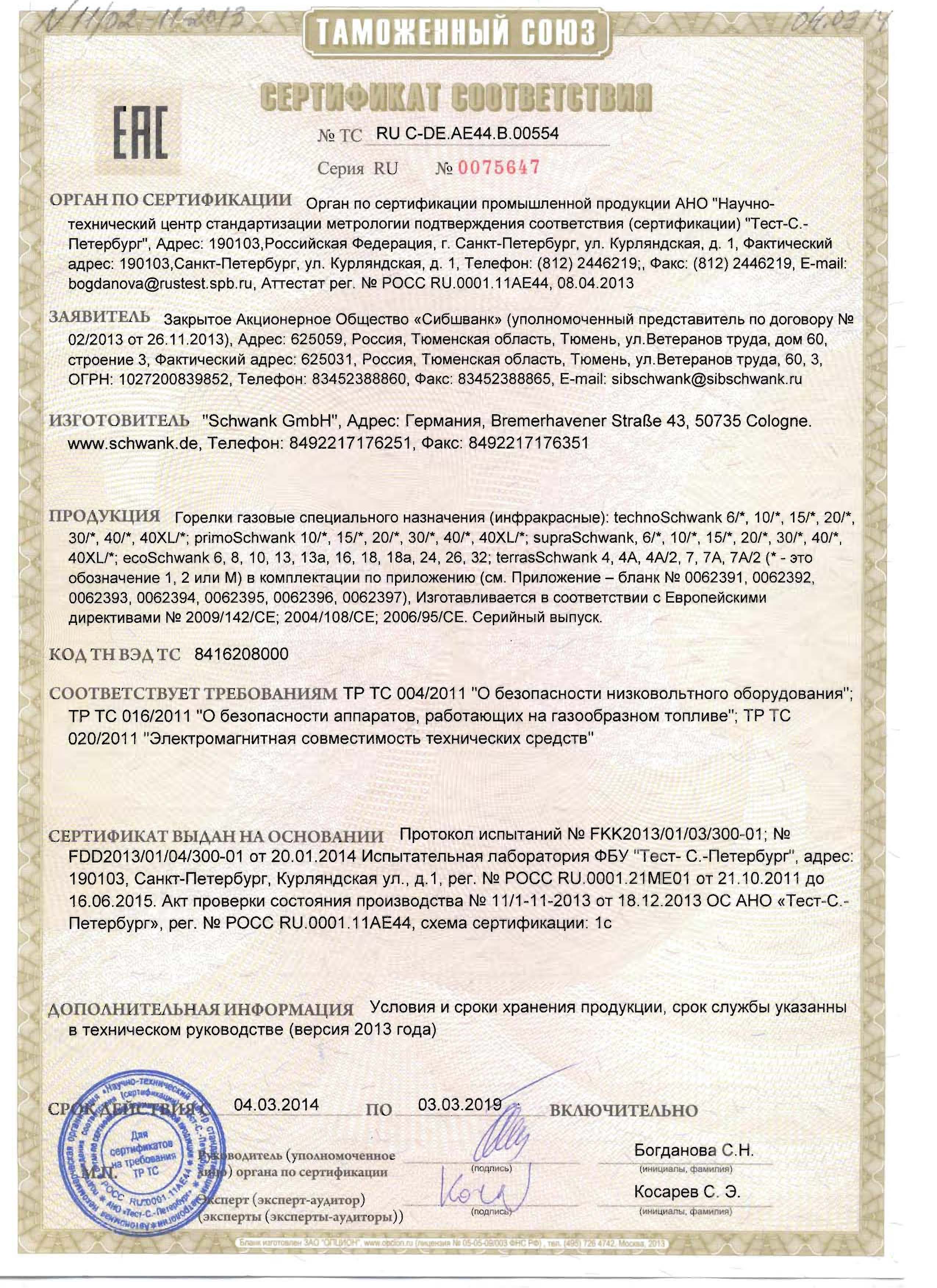 - Сертификат соответствия на горелки газовые technoSchwank, страница 1