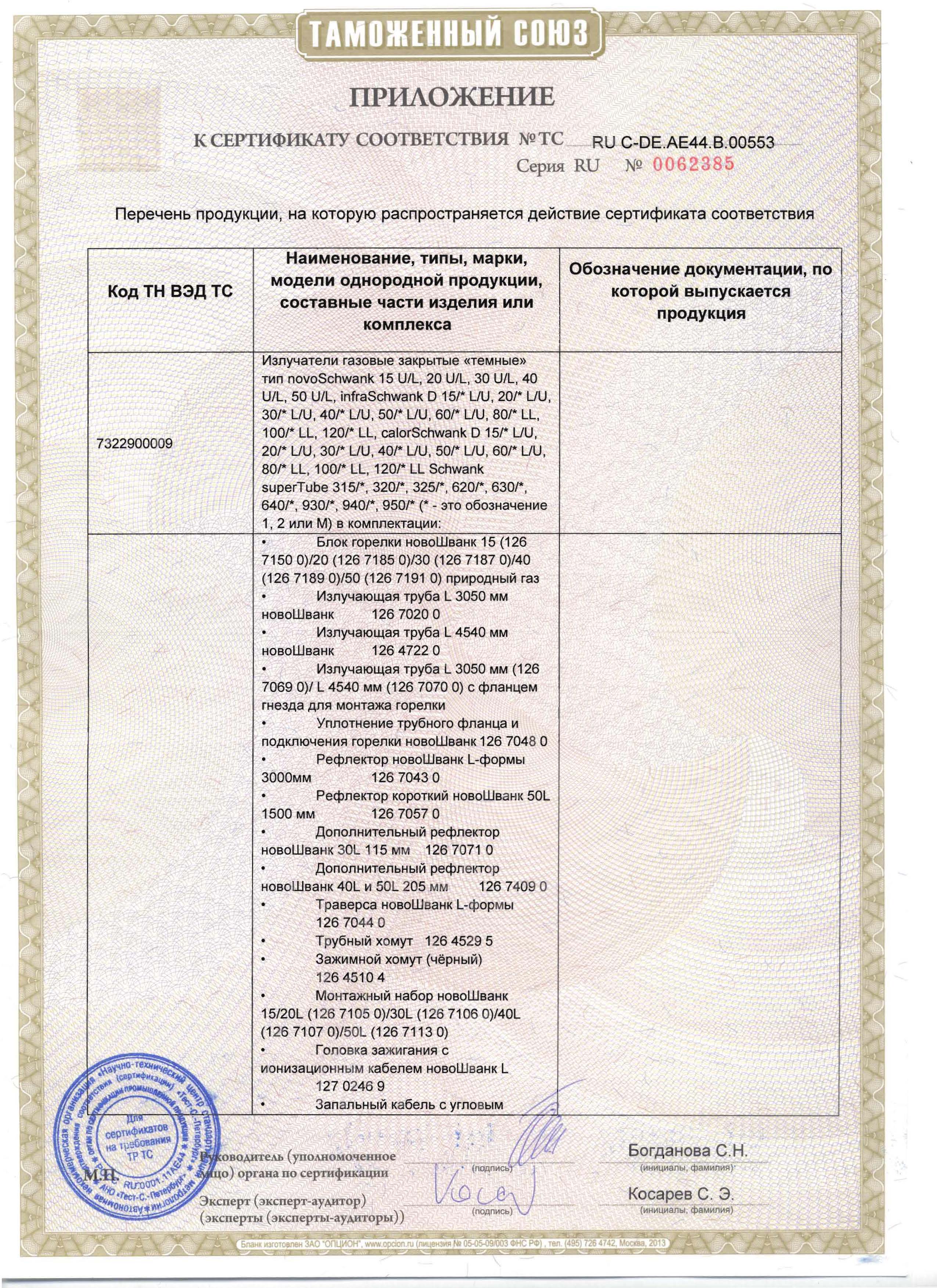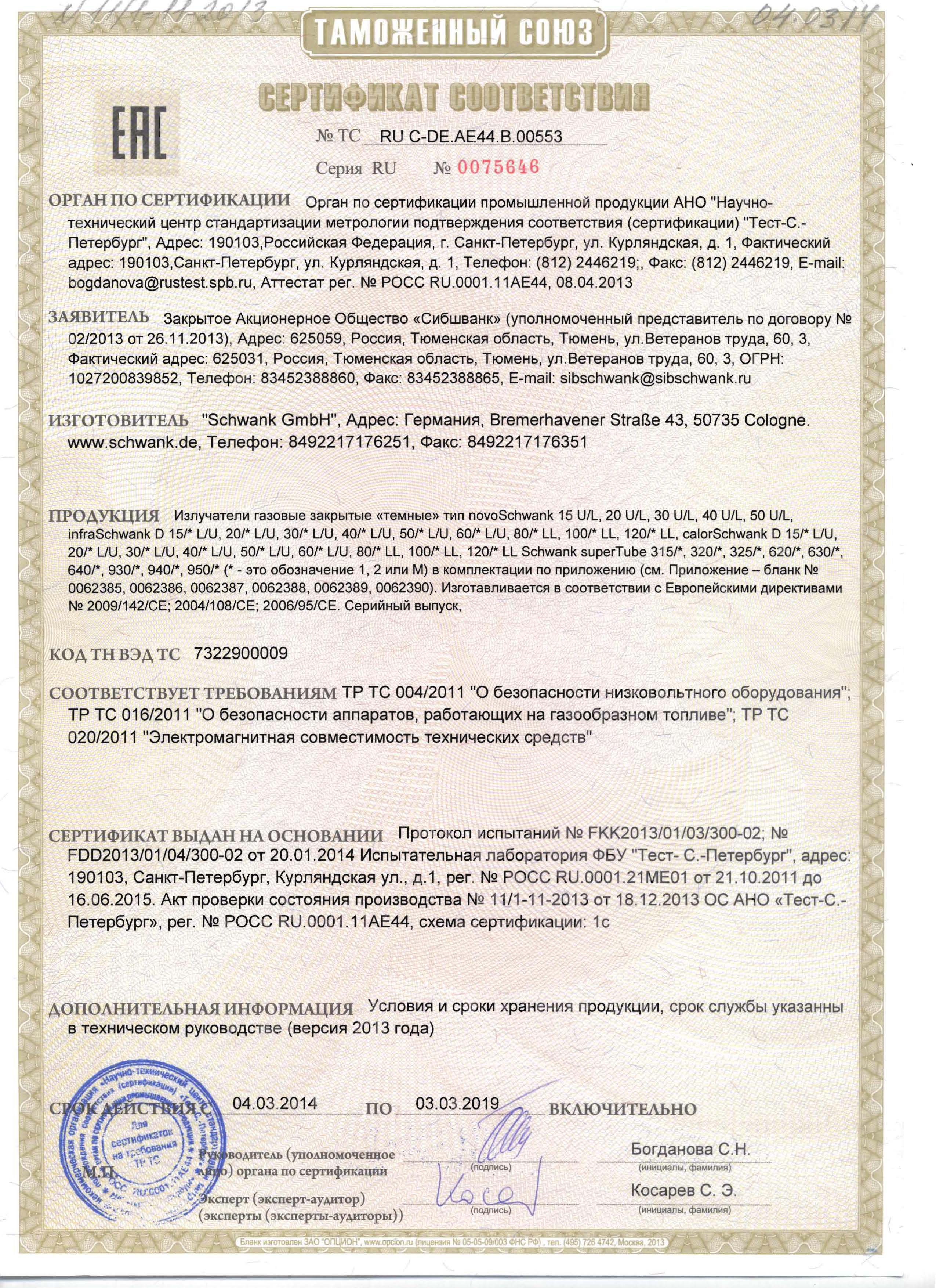 - Сертификат соответствия на излучатели газовые novoSchwank, страница 1