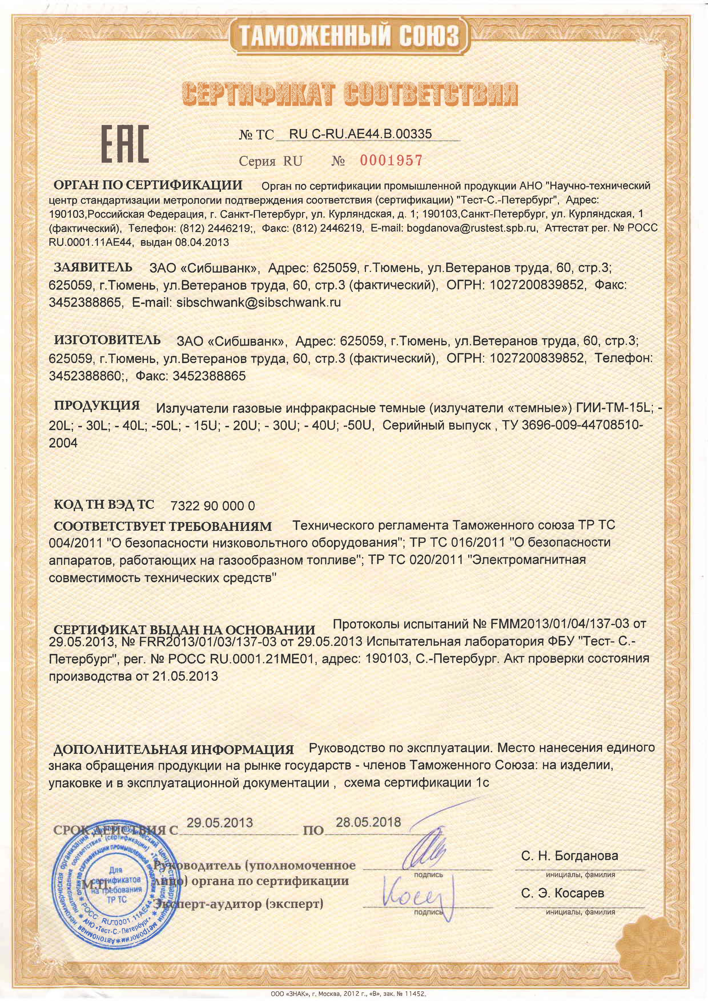 - Сертификат соответствия на излучатели газовые инфракрасные темного типа