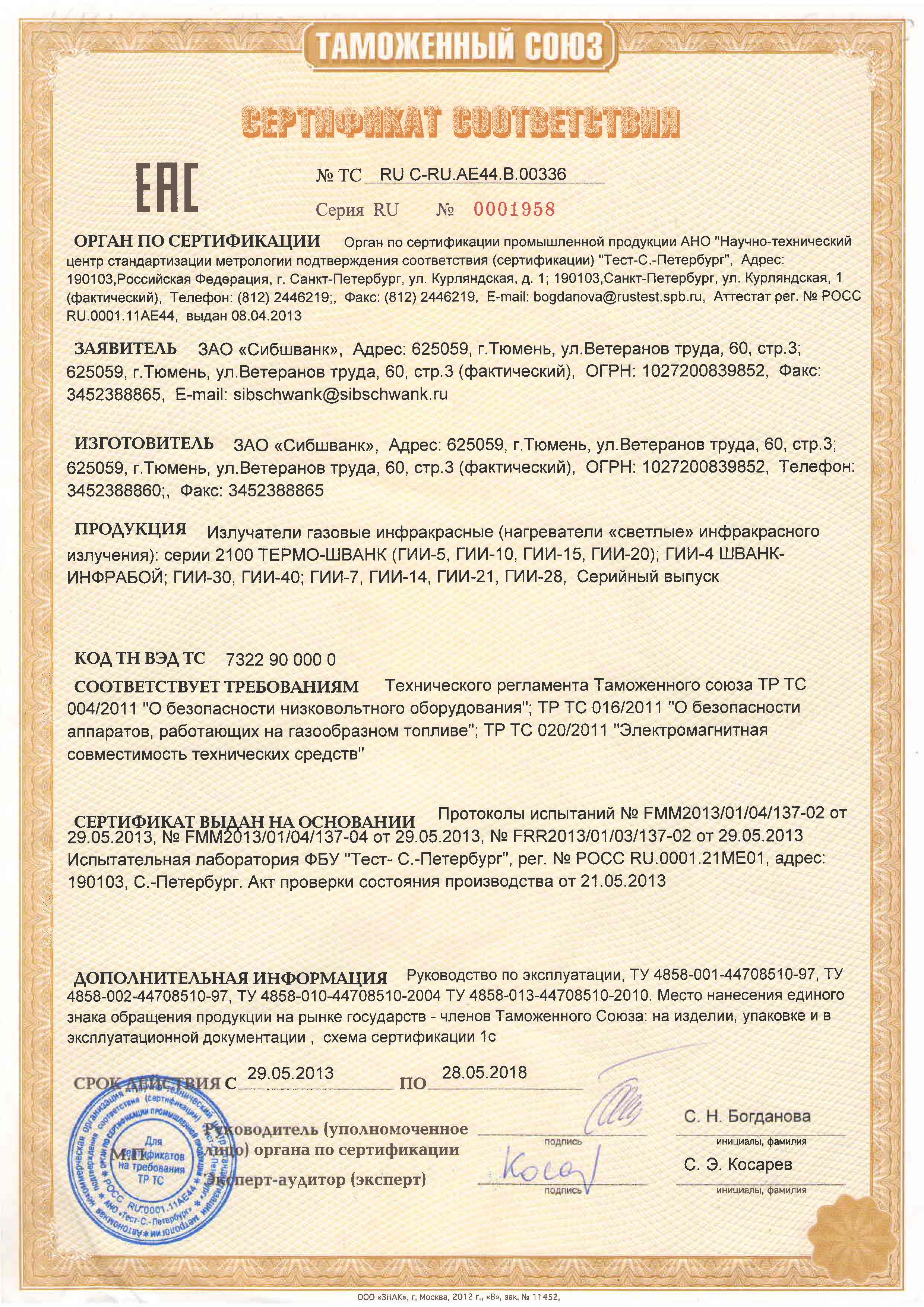 - Сертификат соответствия на излучатели газовые инфракрасные светлого типа