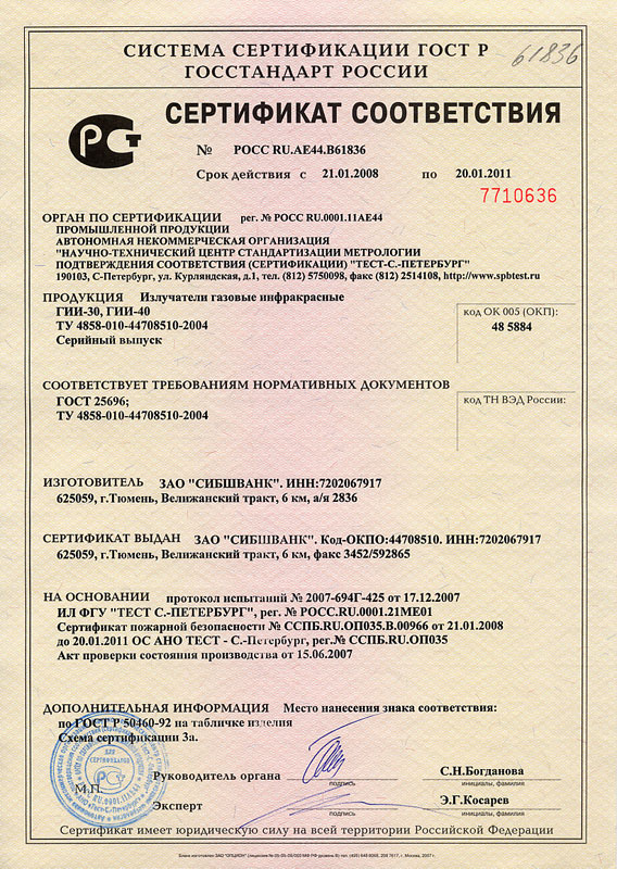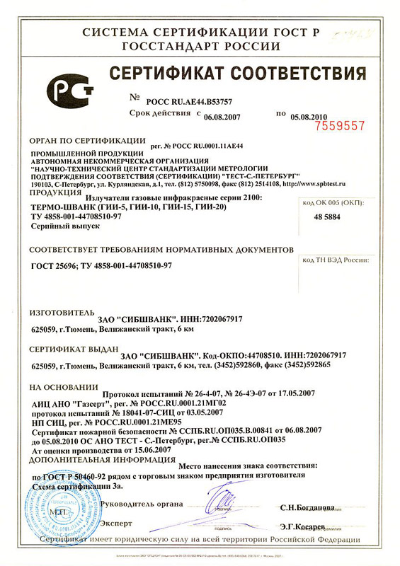 - Сертификат соответствия госстандарта на излучатели газовые инфракрасные ГИИ-5, ГИИ-10, ГИИ-15, ГИИ-20