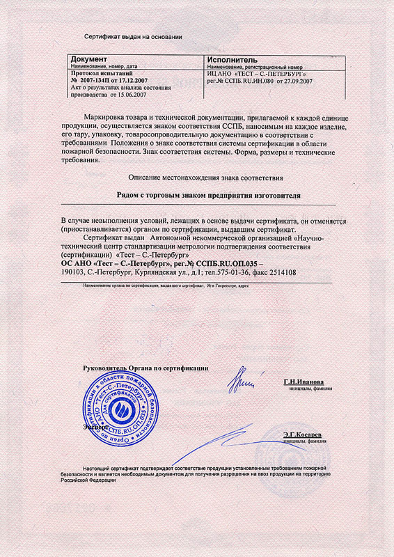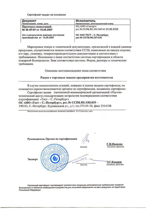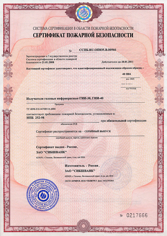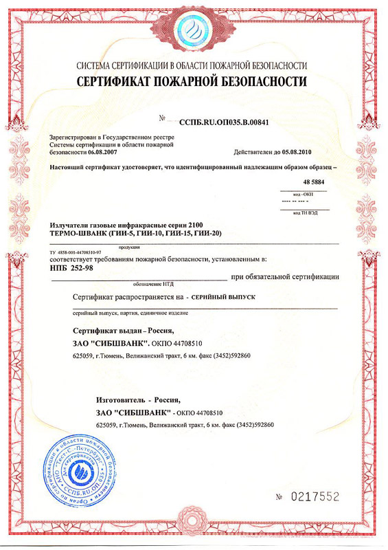 - Сертификат пожарной безопасности на излучатели газовые инфракрасные ГИИ-5, ГИИ-10, ГИИ-15, ГИИ-20