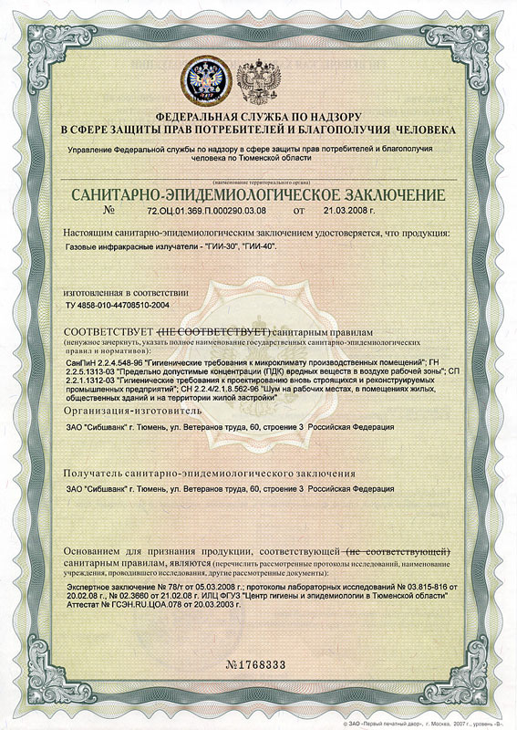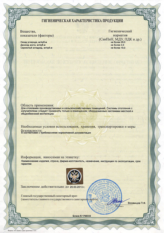 - Санитарно-эпидемиологическое заключение на газовые инфракрасные излучатели ГИИ-30, ГИИ-40