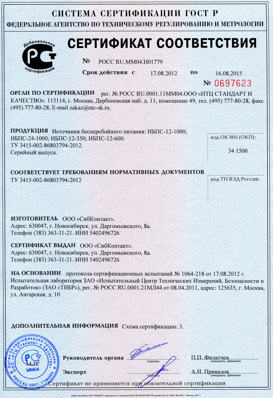 Сертификат соответствия № РОСС RU.ММ04.Н01779 на продукцию СибКонтакт