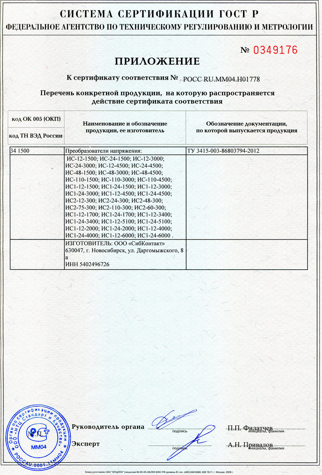 Приложение к сертификату соответствия № РОСС RU.ММ04.Н01778 на продукцию СибКонтакт