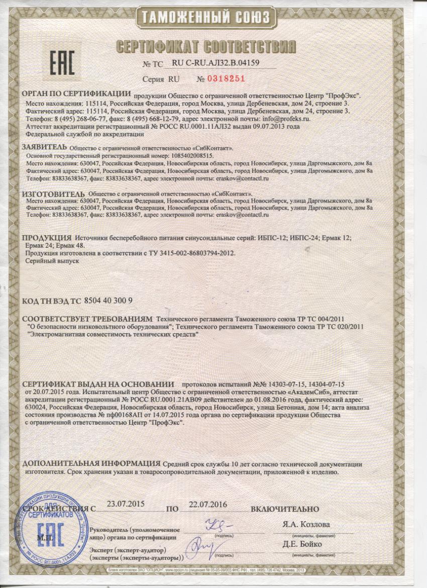 Сертификат соответствия № РОСС RU.ММ04.Н01778 на продукцию СибКонтакт