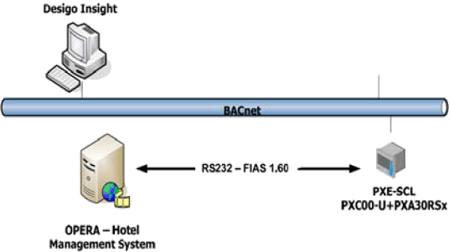 Интерфейс между DESIGO и FIDELIO PMS осуществляется при помощи платформы интеграции PX-OPEN со специальным приложением. FIDELIO PMS подключается к ПК через последовательный порт RS232 интерфейса интеграционной карточки PXA30-RSx, установленной в PXС00-U.