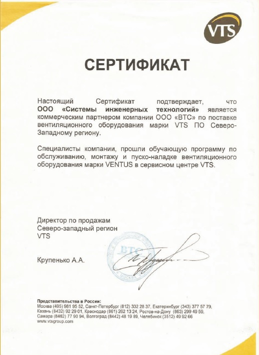 Сертификат коммерческого партнера ООО «ВТС»