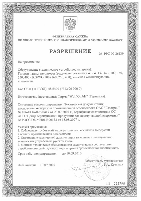 Разрешение федеральной службы по экологическому, технологическому и атомному надзору на применение газовых теплогенераторов Wolf
