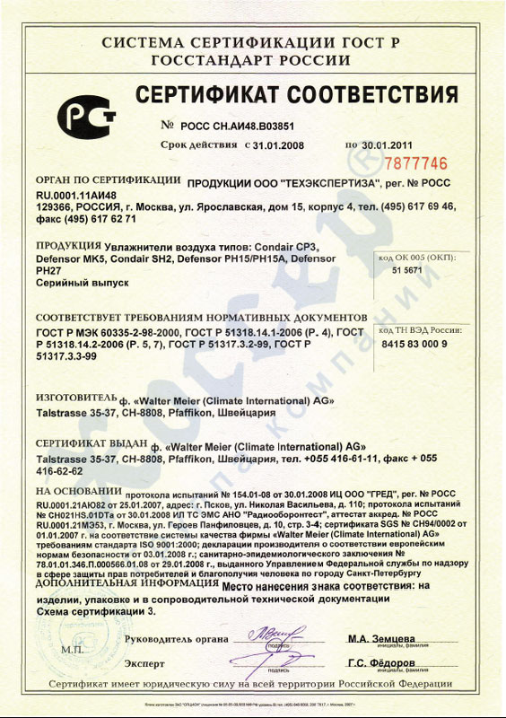 Сертификат соответствия Госстандарта РФ на увлажнители воздуха Walter Meier