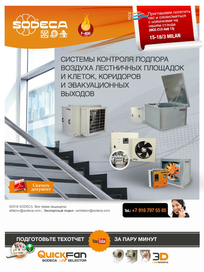 Новинка в системах контроляКомпания Sodeca представляет системы контроля подпора воздуха лестничных площадок, клеток, коридоров и эвакуационных выходов.
