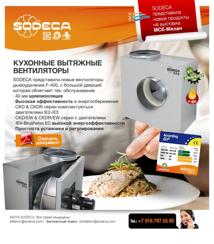 Компания Sodeca представила новые вентиляторы дымоудаления категории F-400 для промышленных кухонь. Корпус представляет собой прочную оболочку с 40 мм шумоизоляцией и оснащен большой дверцей для облегчения доступа во время технического обслуживания.