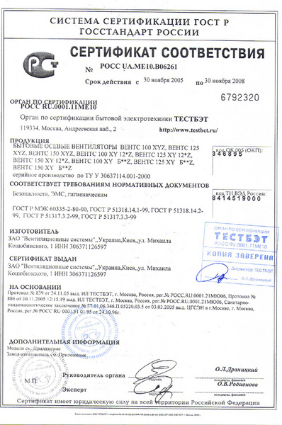Сертификат соответствия госстандарта на вентиляторы ВЕНТС XY, XYZ