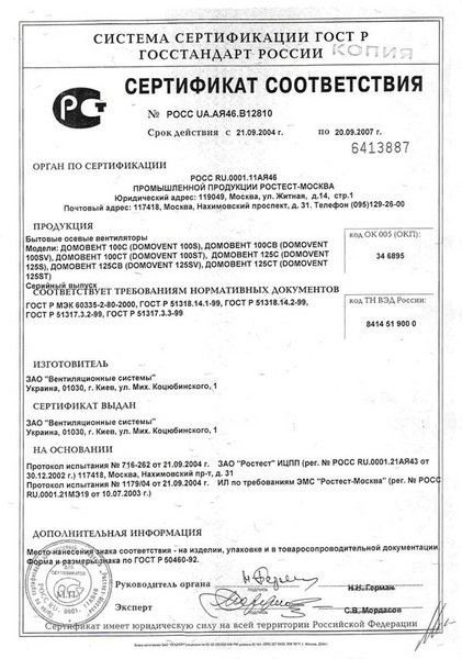 Сертификат соответствия госстандарта на вентиляторы ВЕНТС ДОМОВЕНТ