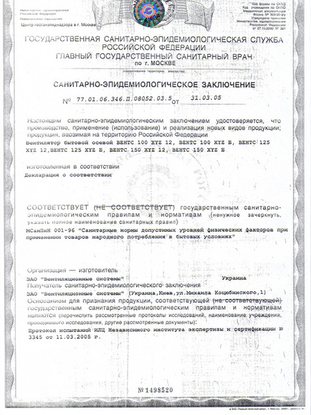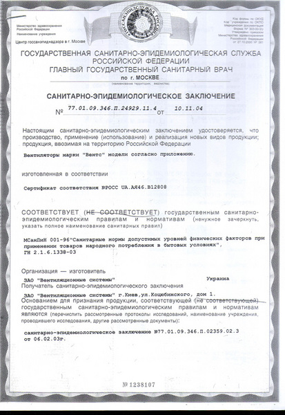 Санитарно-эпидемиологическое заключение на вентиляторы ВЕНТС