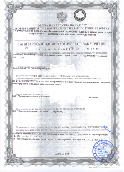 Санитарно-эпидемиологическое заключение на решетки вентиляционные ВЕНТС, ДОМОВЕНТ