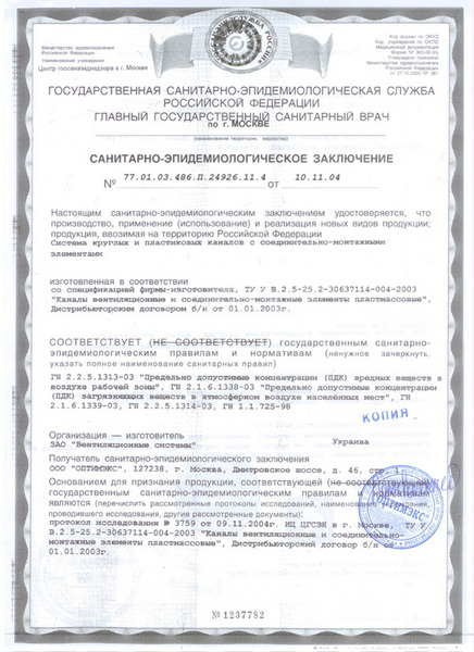 Санитарно-эпидемиологическое заключение на системы круглых пластиковых каналов с соединительно-монтажными элементами производства ВЕНТС