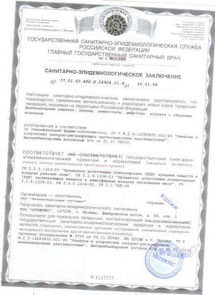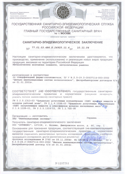 Санитарно-эпидемиологическое заключение на решетки, дверцы, анемостаты, диффузоры производства ВЕНТС