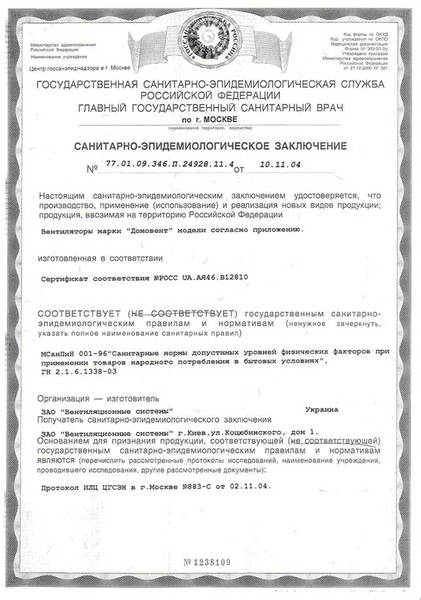 Санитарно-эпидемиологическое заключение на вентиляторы Домовент