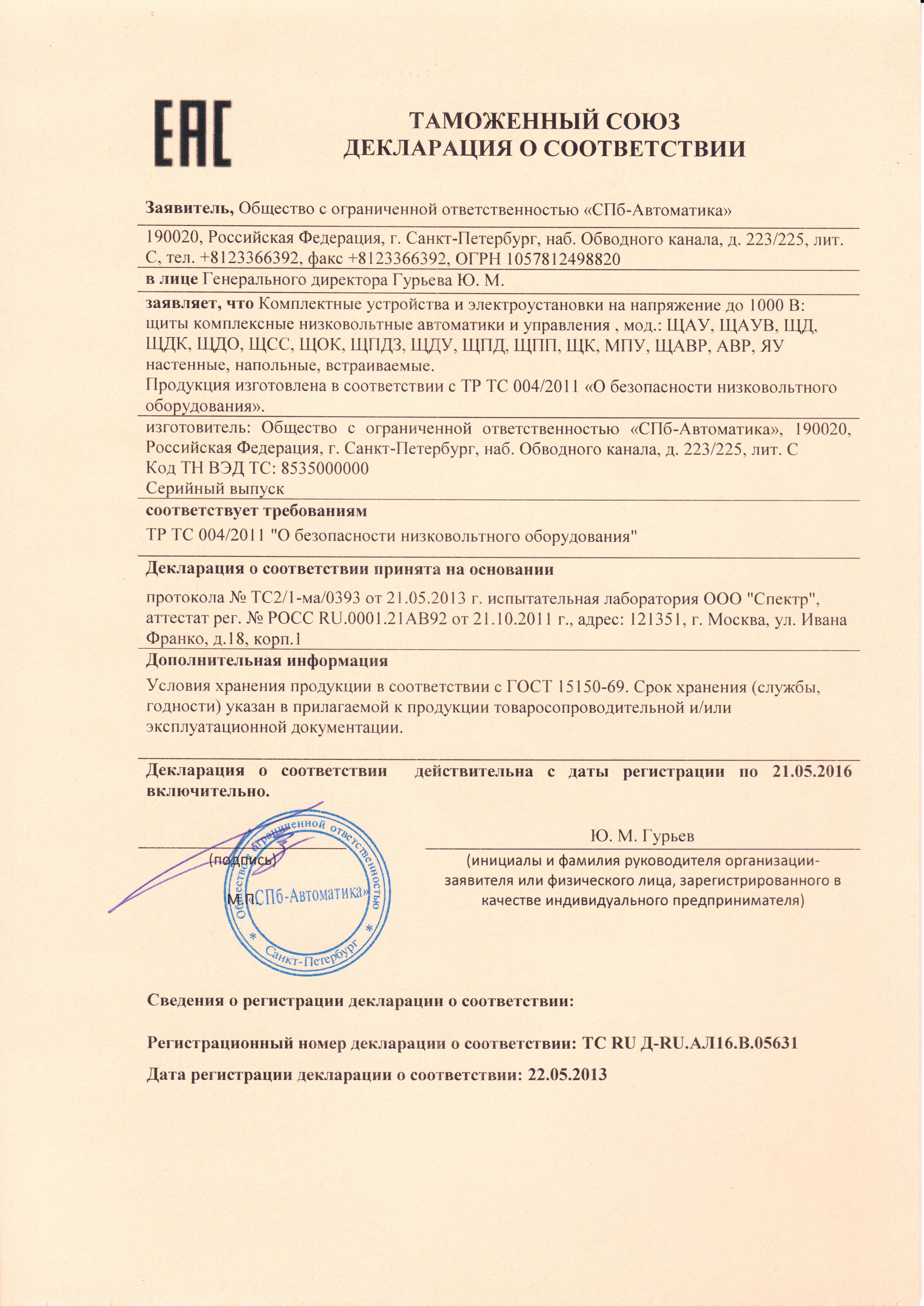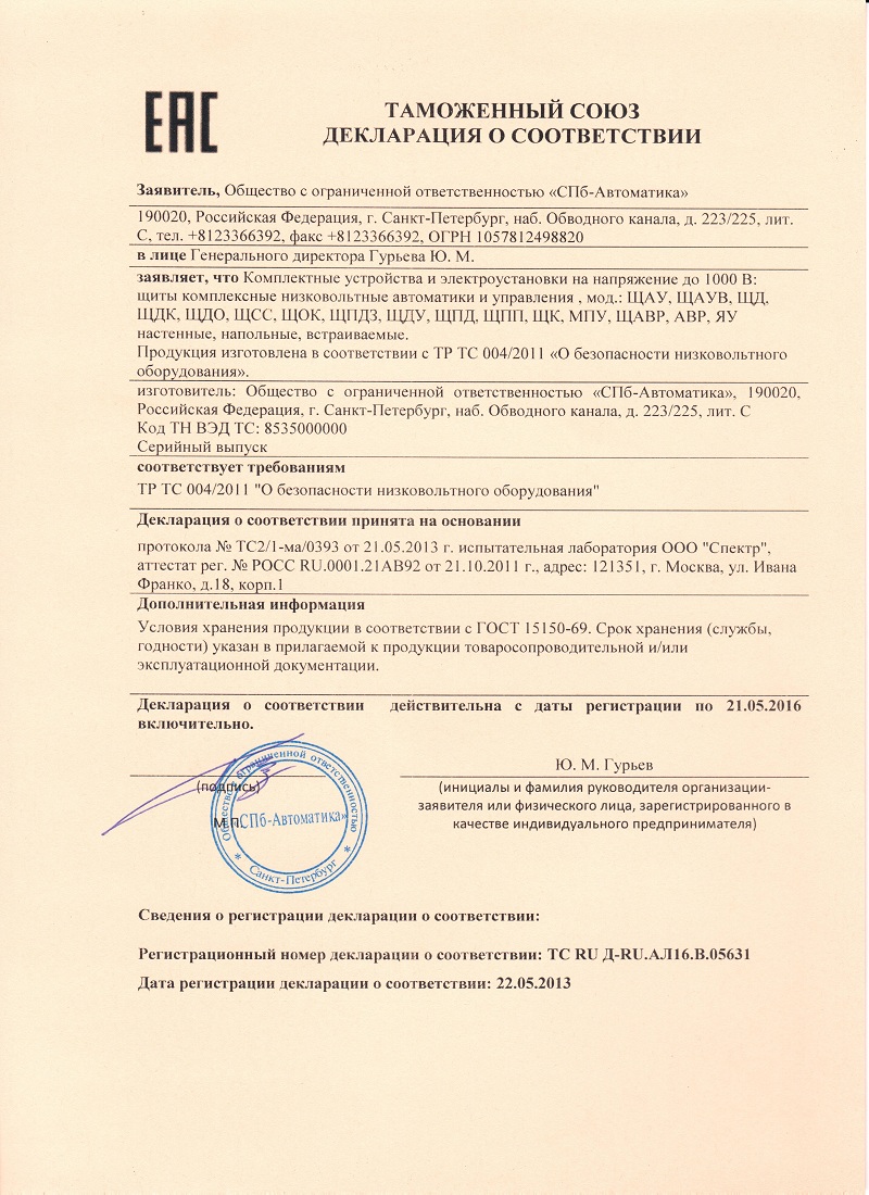 - Декларация о соответствии. Щиты автоматики.
