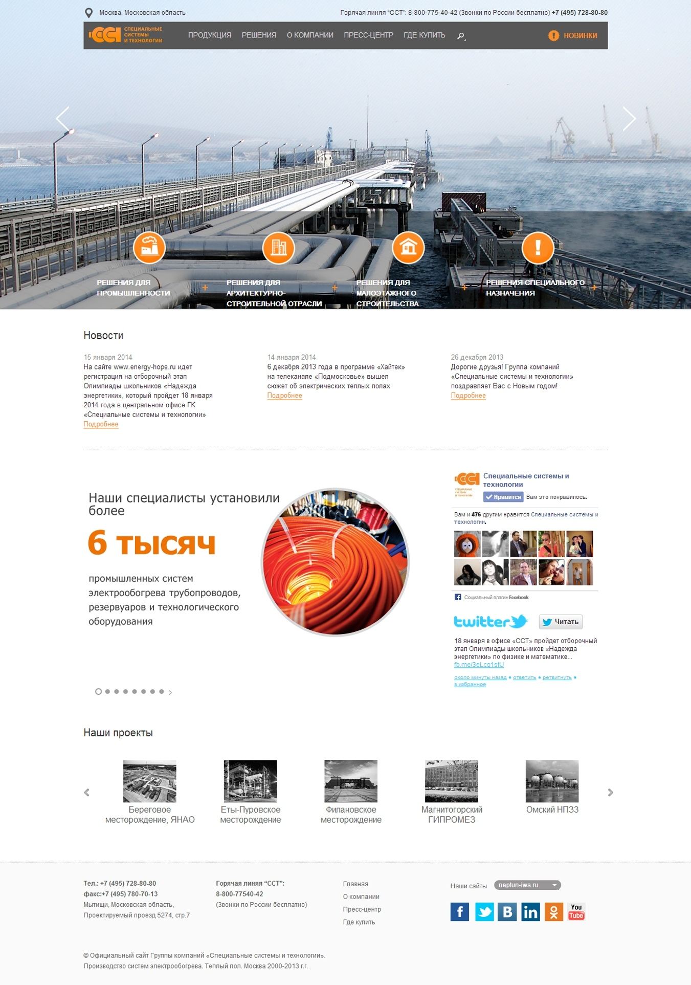 Структура сайта позволяет быстро получить информацию о решениях «ССТ» в области промышленного электрообогрева, узнать новости компании, получить оперативную консультацию, найти контакты ближайшего дилера «ССТ».