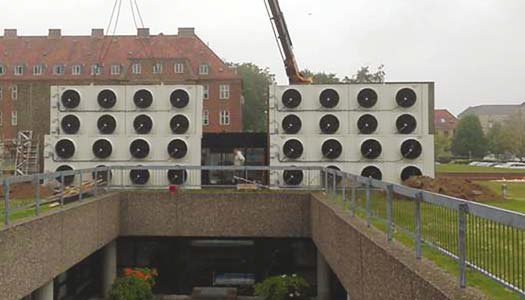 Система кондиционирования больничного комплекса с функцией естественного охлаждения. 8 плоских агрегатов оснащены низкоскоростными вентиляторами с электродвигателями ЕС последнего поколения, отвечающими требованиям самых строгих стандартов по уровню шума. Это связано с близостью агрегатов к больнице и прилегающим жилым зданиям. Агрегаты в вертикальной конфигурации установлены один над другим, поэтому они отвечают требованиям по низкому энергопотреблению и по ограничению монтажного пространства.