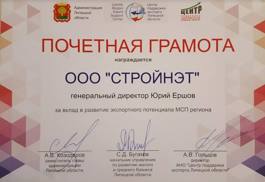 В 2017 году ООО «СТРОЙНЭТ» отправила свою продукцию на экспорт в Казахстан и Беларусь, в 2018 году планирует расширять границы сотрудничества.