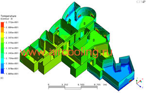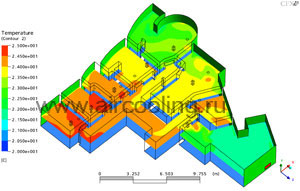 | При непродуманной расстановке элементов системы вентиляции и кондиционирования неравномерность температуры в жилых зонах достигает 6 градусов. Это вызывает сильные вертикально расслоенные сквозняки, когда у пола холодный воздух движется в одном направлении, выше - теплый воздух идет в противоположную сторону. | Численное моделирование позволяет «проиграть» множество вариантов компоновки системы и выбрать наилучший с точки зрения обеспечения наиболее равномерной температуры в каждом помещении. |