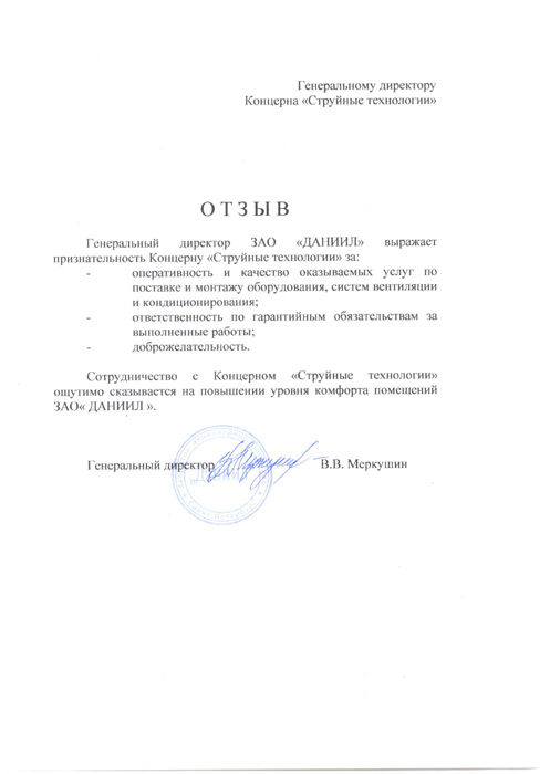 Генеральный директор ЗАО «ДАНИИЛ» выражает признательность Концерну «Струйные технологии» за: