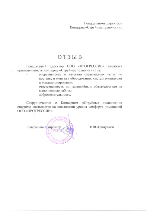 Сотрудничество с Концерном «Струйные технологии» ощутимо сказывается на повышении уровня комфорта помещений ЗАО « ПРОГРЕССИВ ».