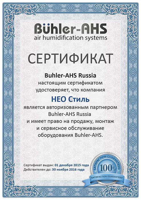 Самарской компании НЕО Стиль после реализации ряда проектов присвоен статус авторизованного партнера Buhler-AHS Russia с правом продажи, монтажа и сервисного обслуживания оборудования канадского завода Buhler-AHS, производителя систем адиабатического увлажнения воздуха для дома, квартиры и офиса.