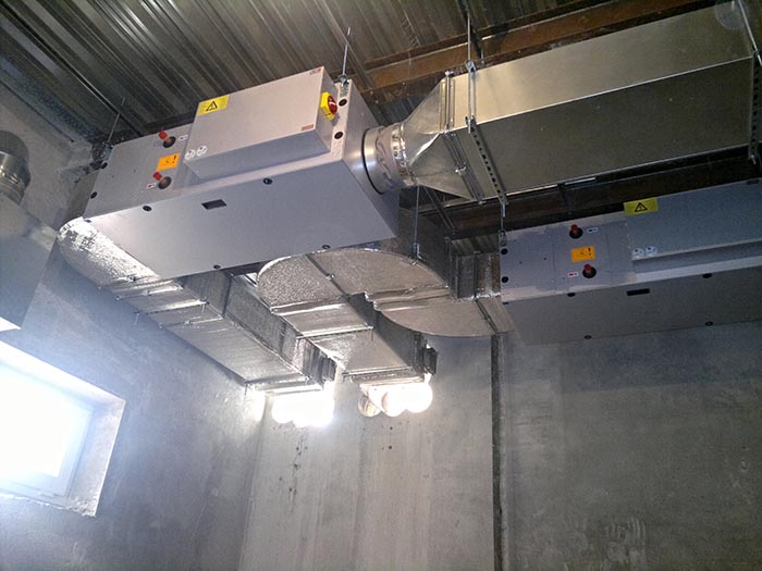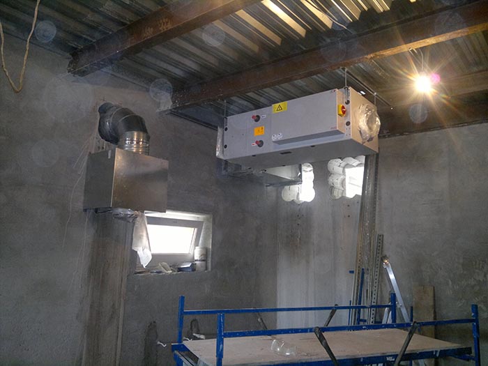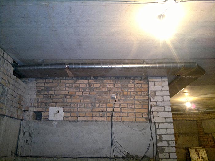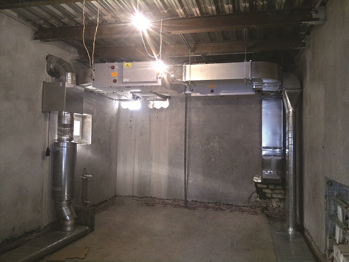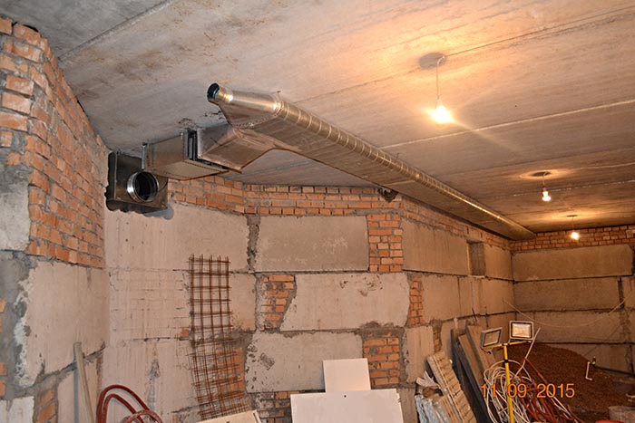 Все вентоборудование расположено над цоколем в гараже дома. Основная разводка плоскоовальными воздуховодами была выполнена до стяжки по полу гаража.