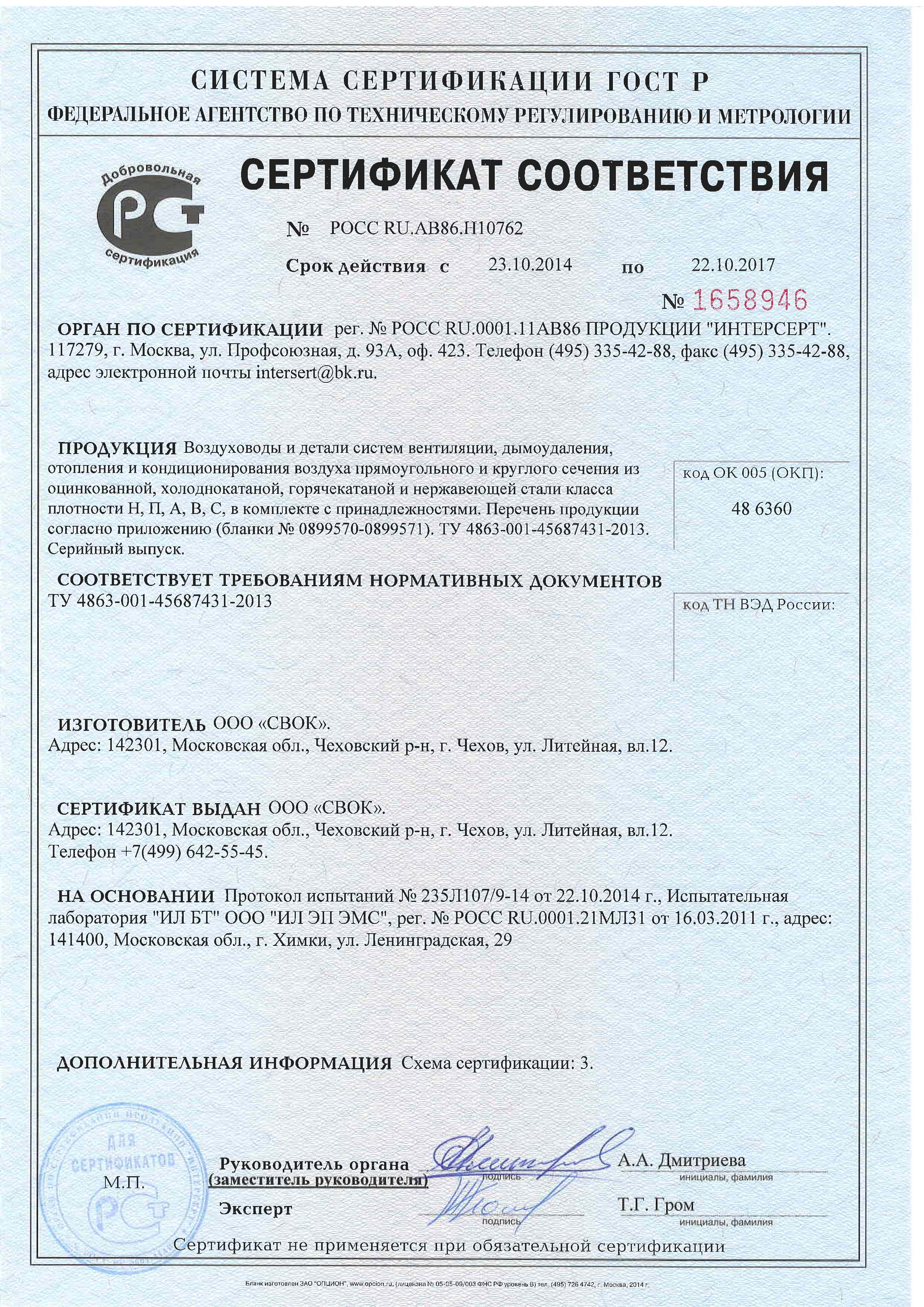 Сертификат соответствия на воздуховоды и детали систем вентиляции СВОК