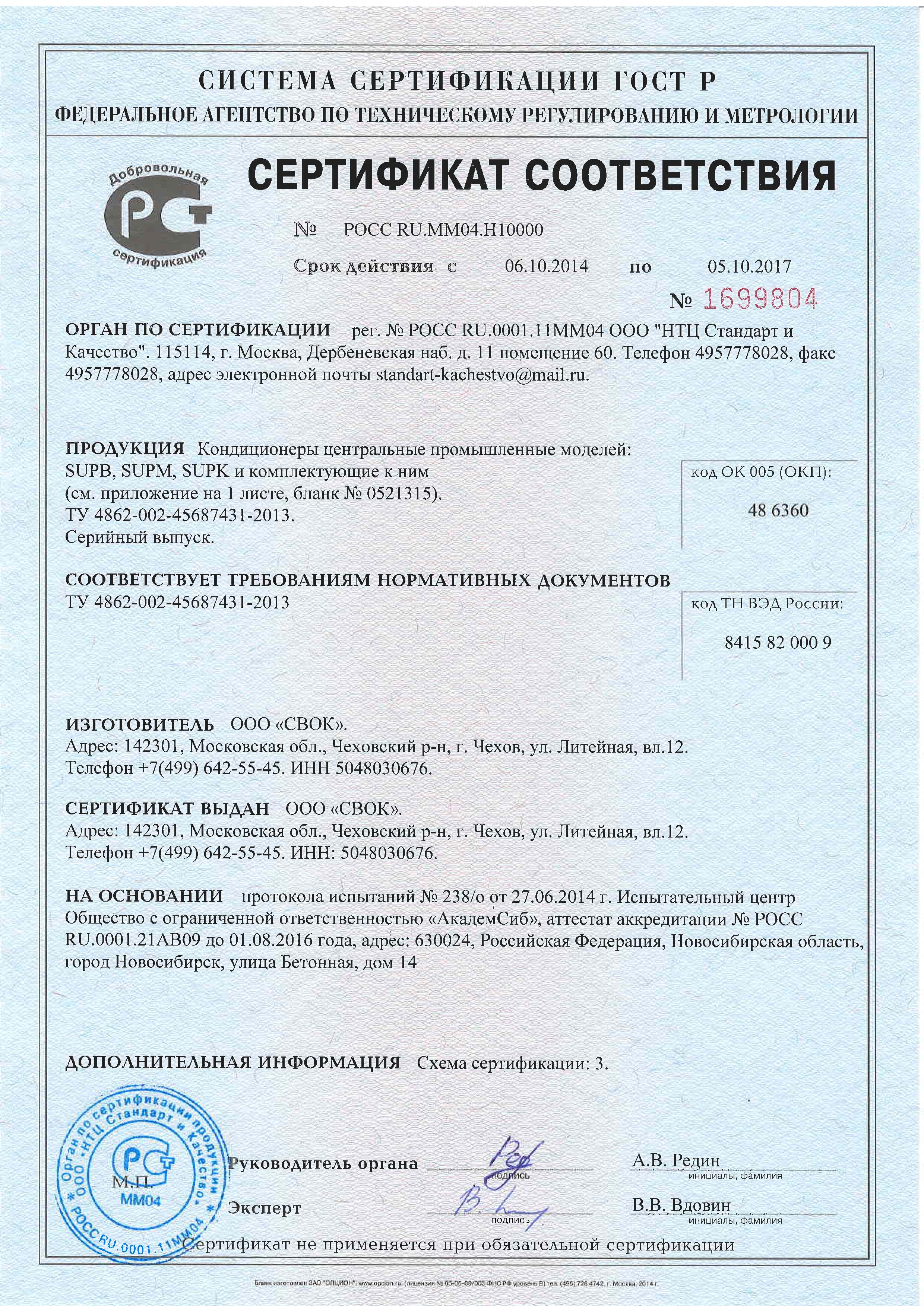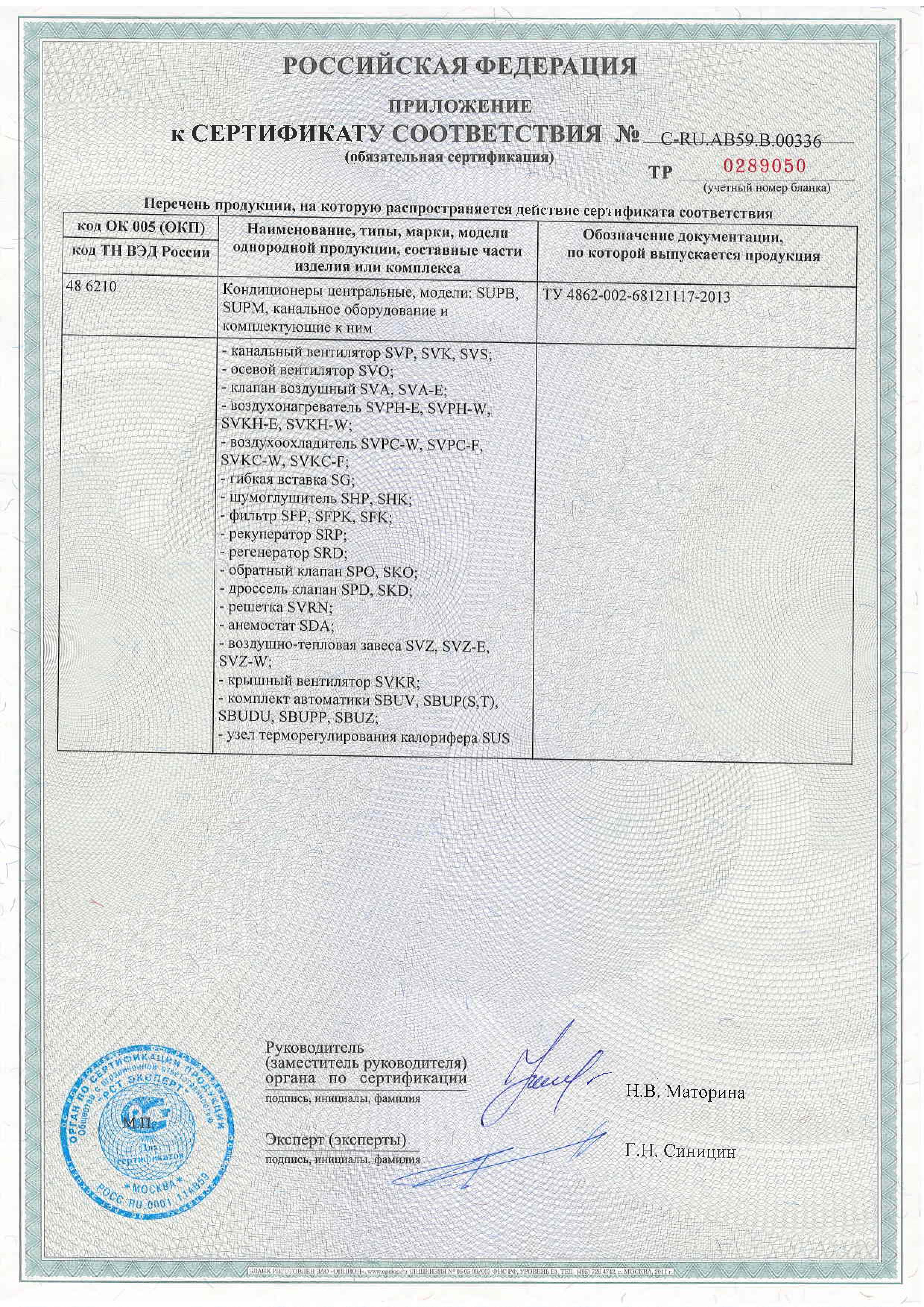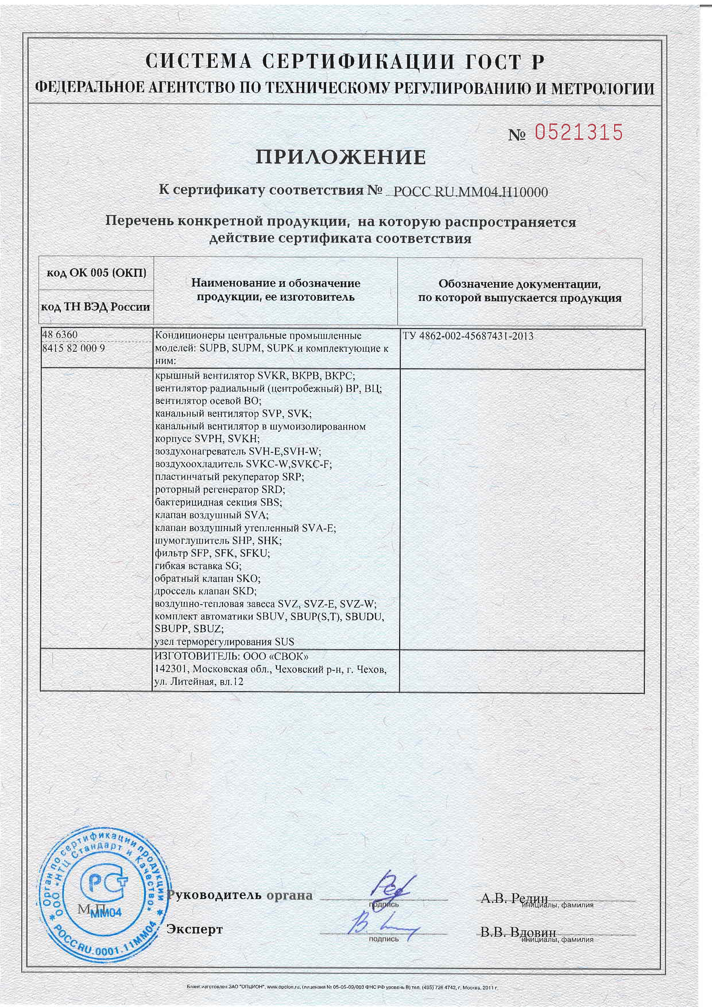 Прилоежине к сертификату соответствия на центральные кондиционеры СВОК