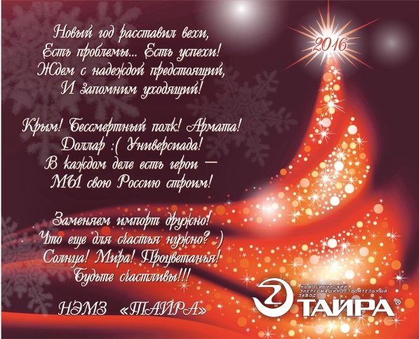 Поздравляем с Новым 2016 Годом!Новый год расставил вехи, Есть проблемы... Есть успехи! Ждем с надеждой предстоящий, И запомним уходящий!