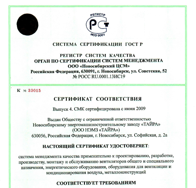 Завод прошел сертификационный аудит СИСТЕМЫ МЕНЕДЖМЕНТА КАЧЕСТВАНовосибирский энергомашиностроительный завод «ТАЙРА» прошел сертификационный аудит СИСТЕМЫ МЕНЕДЖМЕНТА КАЧЕСТВА НА СООТВЕТСТВИЕ ТРЕБОВАНИЯМ ГОСТ Р ИСО 9001-2015 (ISO 9001:2015).