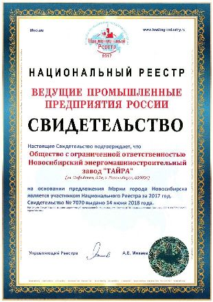 Новосибирский энергомашиностроительный завод «ТАЙРА» включен в Национальный реестр «Ведущие промышленные предприятия России» за 2017 годЗавод «ТАЙРА» внесен в Национальный реестр «Ведущие промышленные предприятия России» за 2017 год.