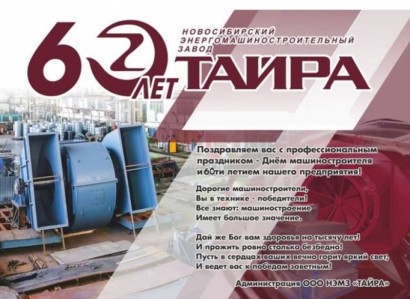 60 лет со дня основания!27 августа 2015 года Новосибирский энергомашиностроительный завод «ТАЙРА» отмечает 60 лет со дня основания.