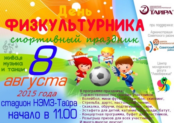08 августа 2015 г. на стадионе НЭМЗ-Тайра состоится ежегодный спортивный праздник, посвященный Дню физкультурника. Компания НЭМЗ-Тайра приглашает Вас, команды вашего предприятия и всех желающих сотрудников принять участие в празднике.