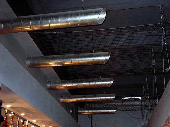 Из оригинальных дизайнерских и технических решений данного объекта можно отметить открытое размещение воздуховодов системы вентиляции в зоне бара ресторана. Это потребовало изготовления высококачественных изделий из нержавеющей стали, высокой культуры монтажа, непростых технических решений по прокладке и закреплению воздуховодов. (рис. 1)
