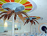 В зоне ресторана реализация приточной вентиляции также тесно увязана с авторским дизайном. Под каждым из устроенных в фальш-потолке подающих отверстий большого диаметра установлена декоративная пальма, металлические листья которой призваны равномерно рассеивать падающий воздушный поток. Такое решение потребовало особенно точной настройки расходов подаваемого воздуха. (рис. 2)