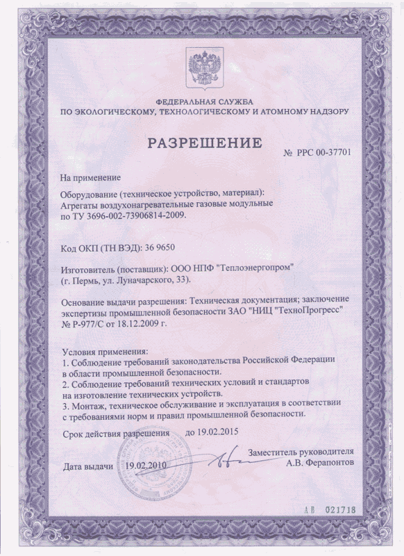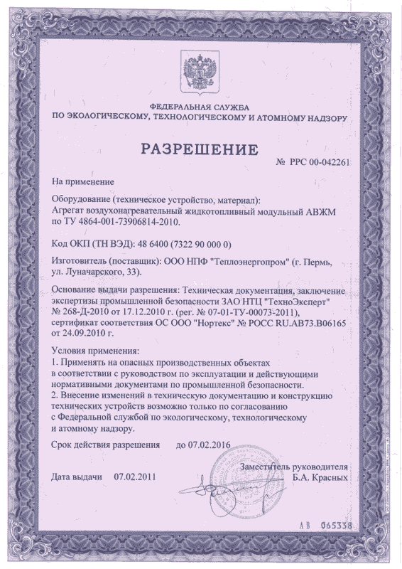 Разрешение на применение воздухонагревателей ЯМАЛ