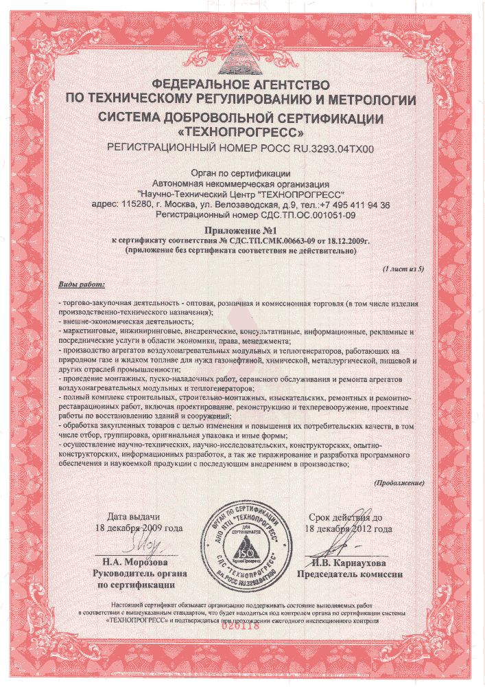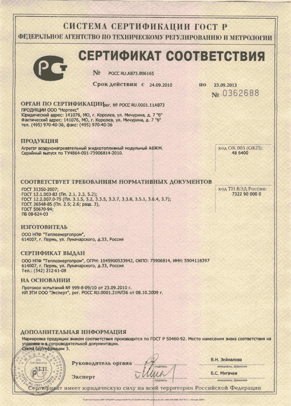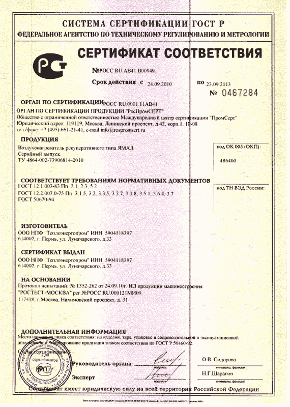 Сертификат соответствия воздухонагревателей ЯМАЛ