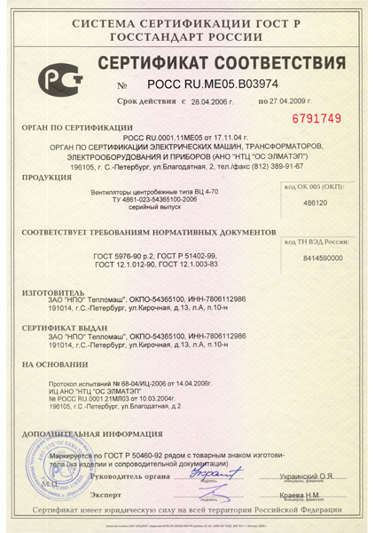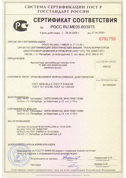 Сертификат соответсвия на вентиляторы центробежные типа ВЦ14-46