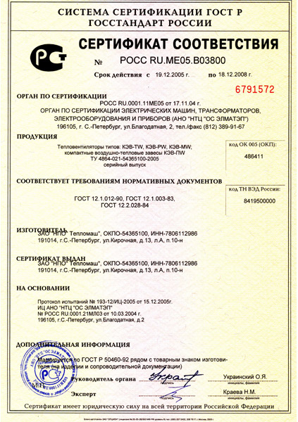 Cертификат соответствия Тепловентиляторы типов КЭВ-TW, КЭВ-PW, КЭВ-MW, компактные воздушно-тепловые завесы КЭВ-ПW